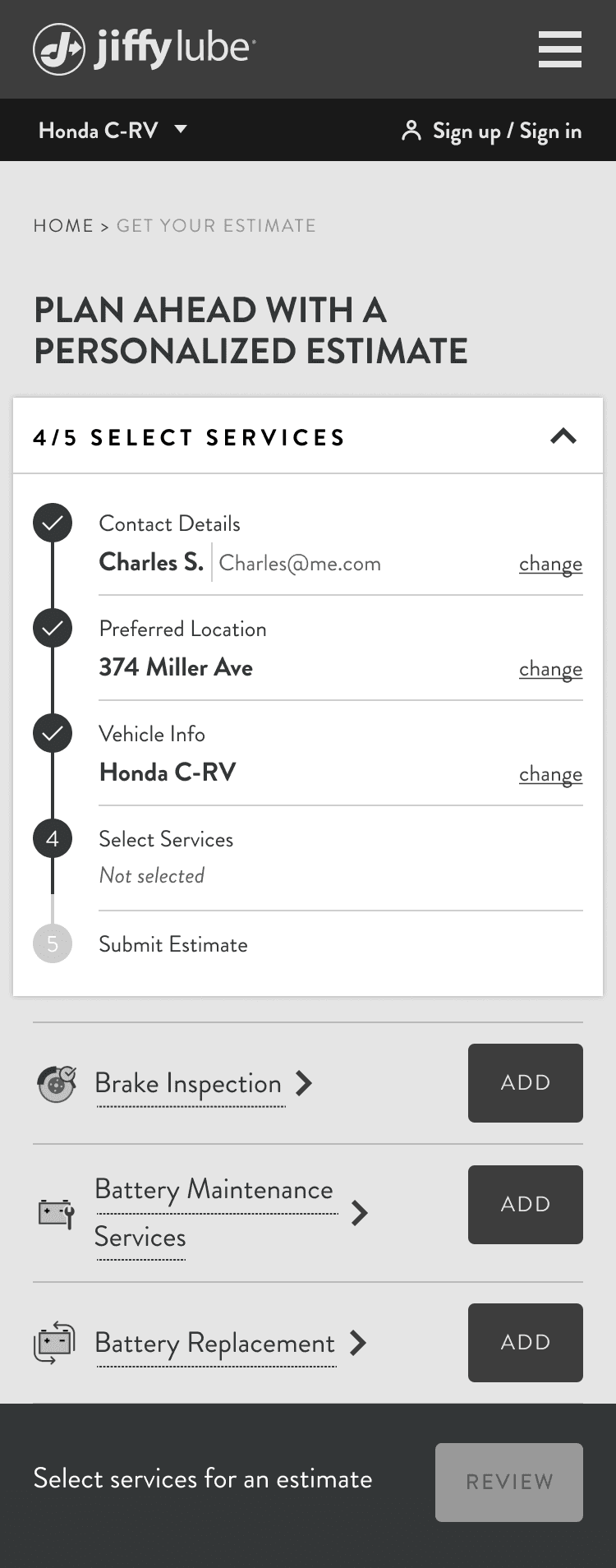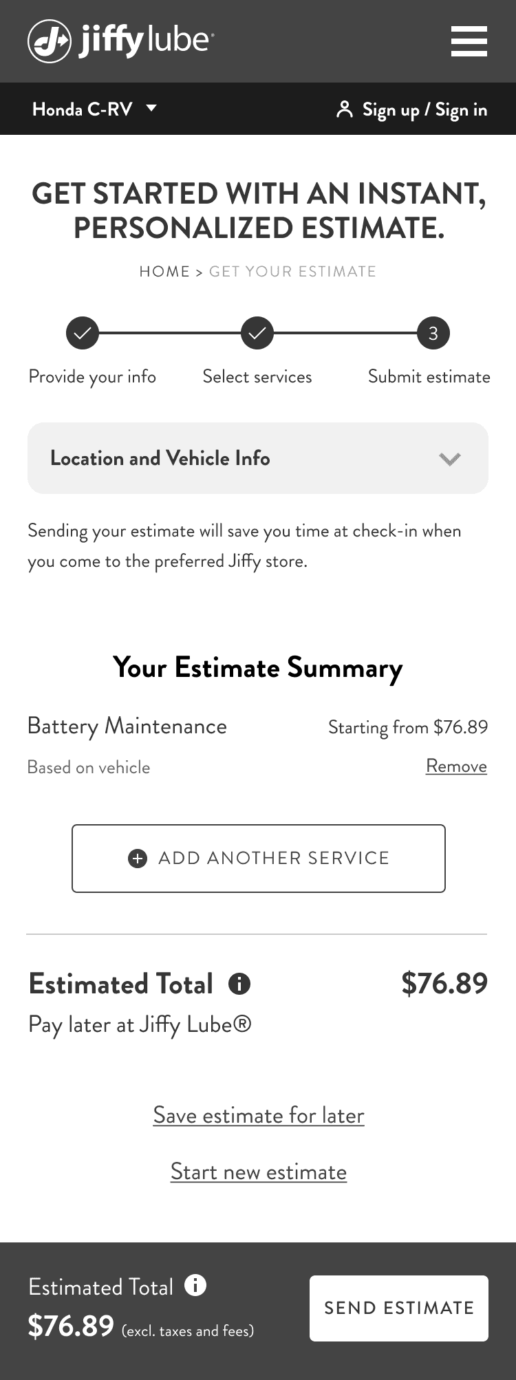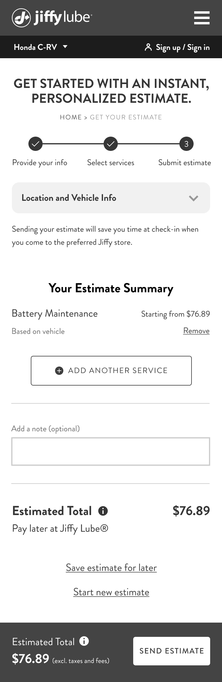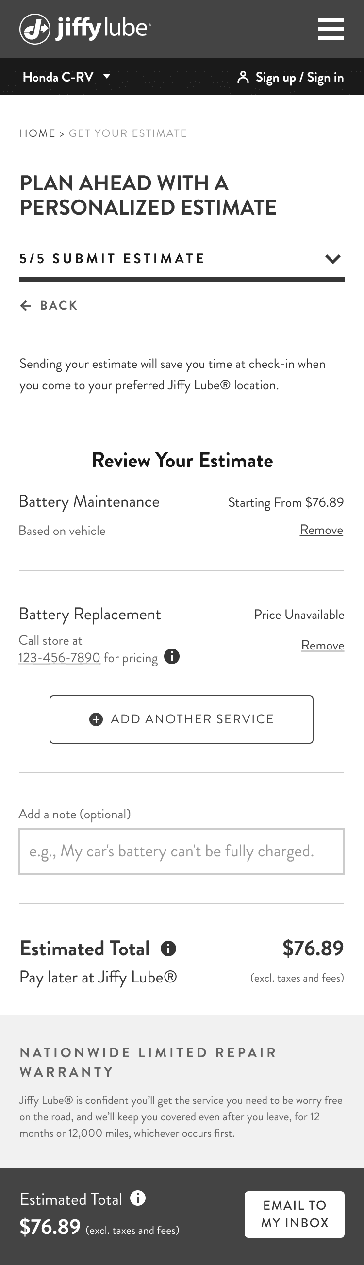 We added an ‘Add a note’ module for users to send personalized details, such as car issues, to their preferred Jiffy Lube location. To reduce distractions, we removed the ‘Save estimate for later’ and ‘Start new estimate’ links from the review page and moved them to a screen after users complete the flow. We also updated the CTA copy from ‘SEND ESTIMATE’ to ‘EMAIL TO MY INBOX’, making the action clearer. This change improves the user experience and ensures the location receives both the estimate and user details for better and faster service.