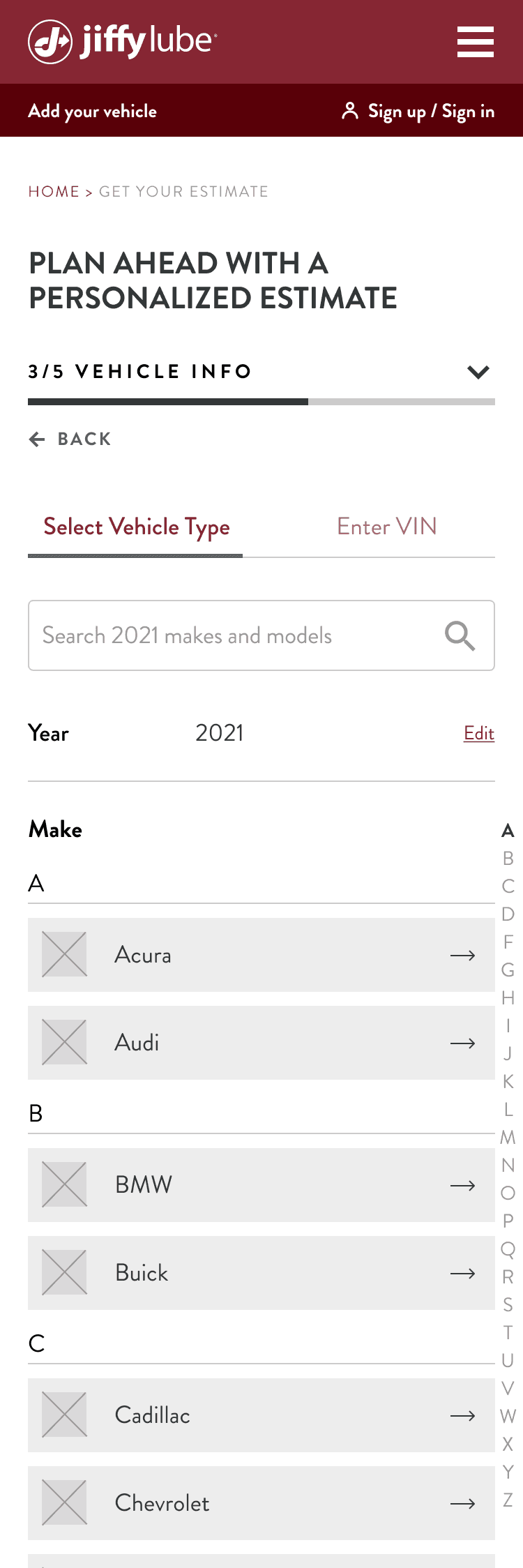 Based on data, we set Select Vehicle as the default input method, as Enter Information Manually had a lower drop-off rate (24.2%) compared to Take Photo Scan (54.2%). To improve usability, we replaced dropdown menus with visible tiles, grouped options alphabetically, and added a search function with jump links. Additionally, we integrated vehicle input into the estimate flow, ensuring a unified title and progress bar for a more seamless experience.
