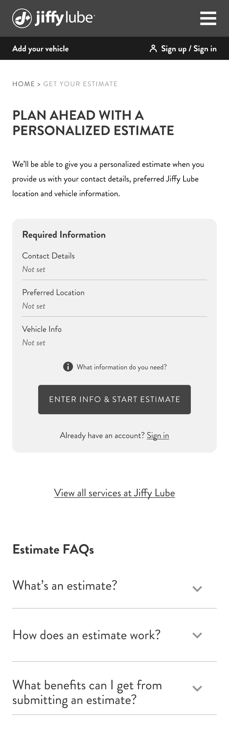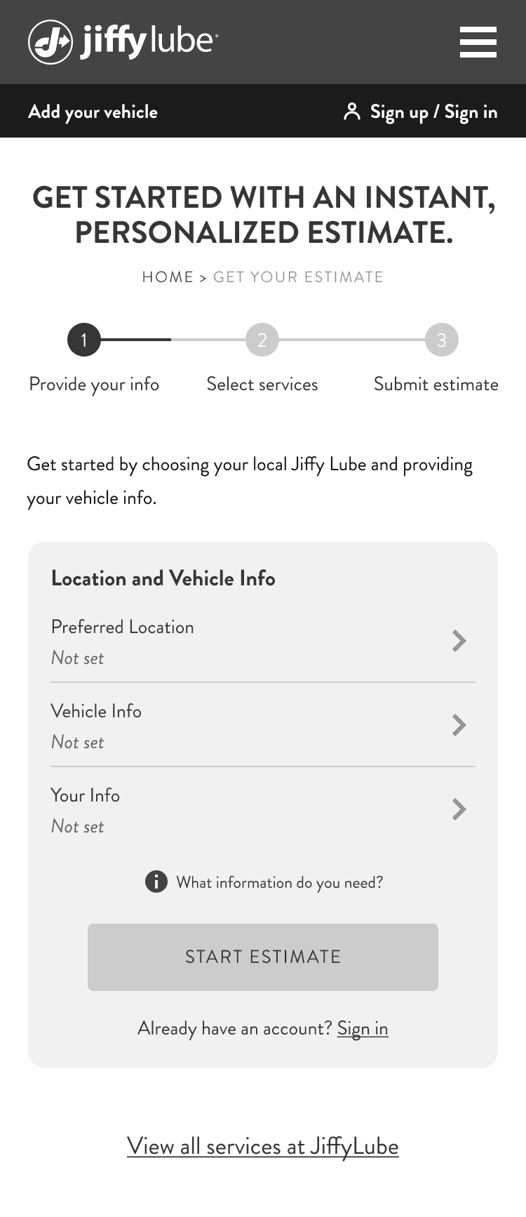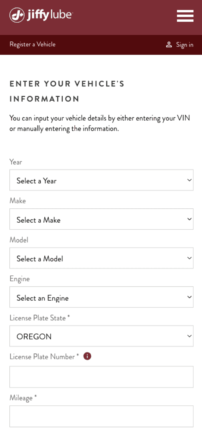 To generate an estimate, Jiffy Lube requires three key details: Personal Information (contact method and name), Vehicle Information (year, make, model, and engine), and Preferred Location. Since users may have already provided some of this info elsewhere on the site, their entry points into the estimate flow vary. They could be authenticated users with all required info or unauthenticated users with none or only partial info. We accounted for all scenarios to ensure a seamless experience for every user.