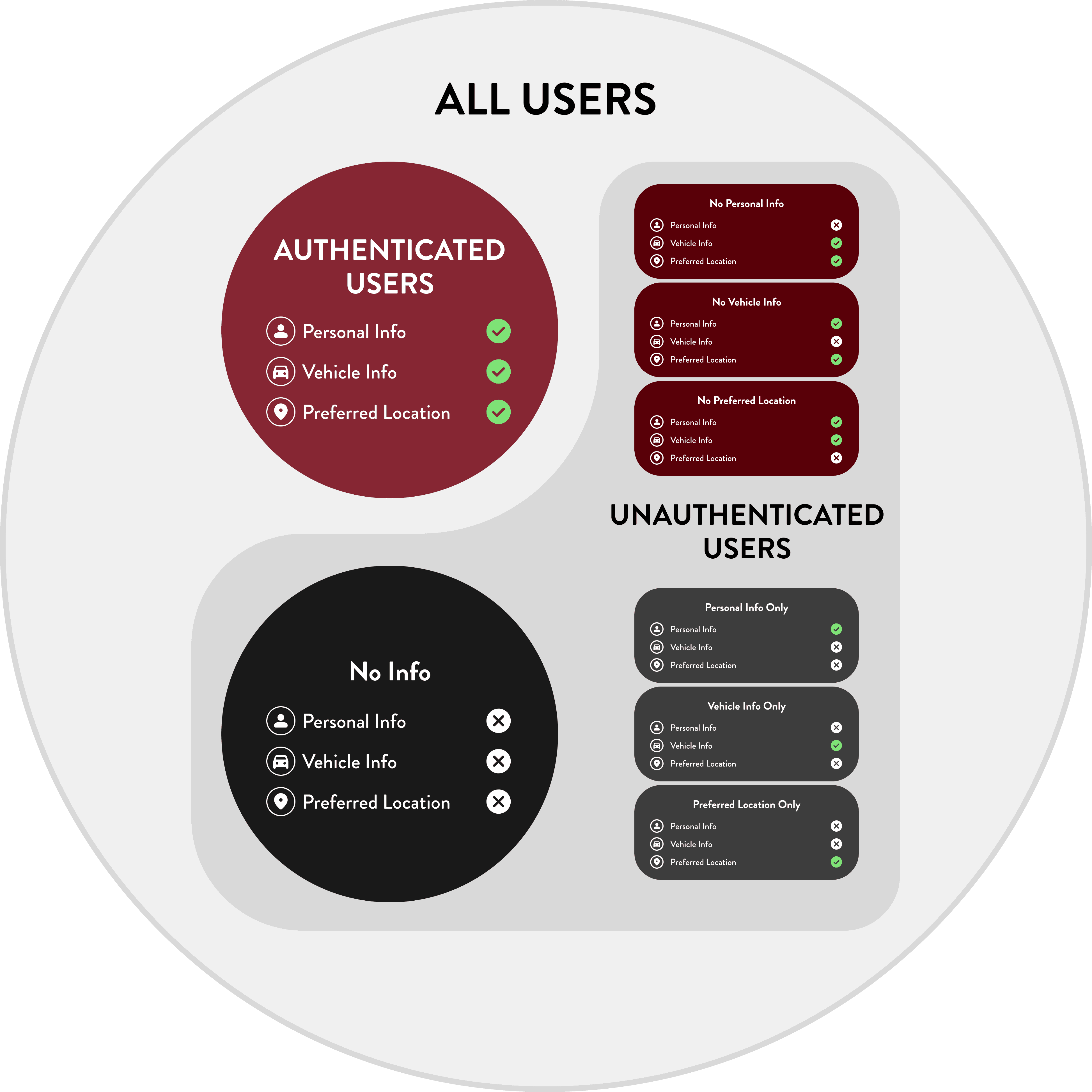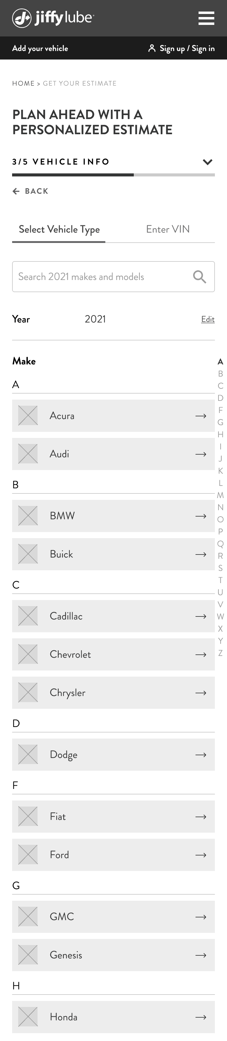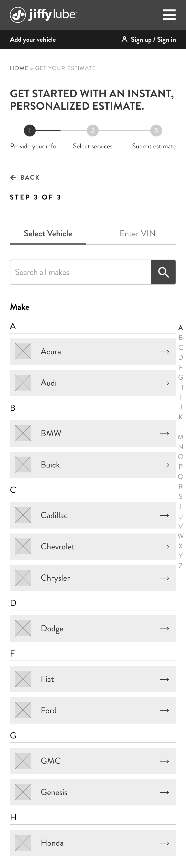 To generate an estimate, Jiffy Lube requires three key details: Personal Information (contact method and name), Vehicle Information (year, make, model, and engine), and Preferred Location. Since users may have already provided some of this info elsewhere on the site, their entry points into the estimate flow vary. They could be authenticated users with all required info or unauthenticated users with none or only partial info. We accounted for all scenarios to ensure a seamless experience for every user.