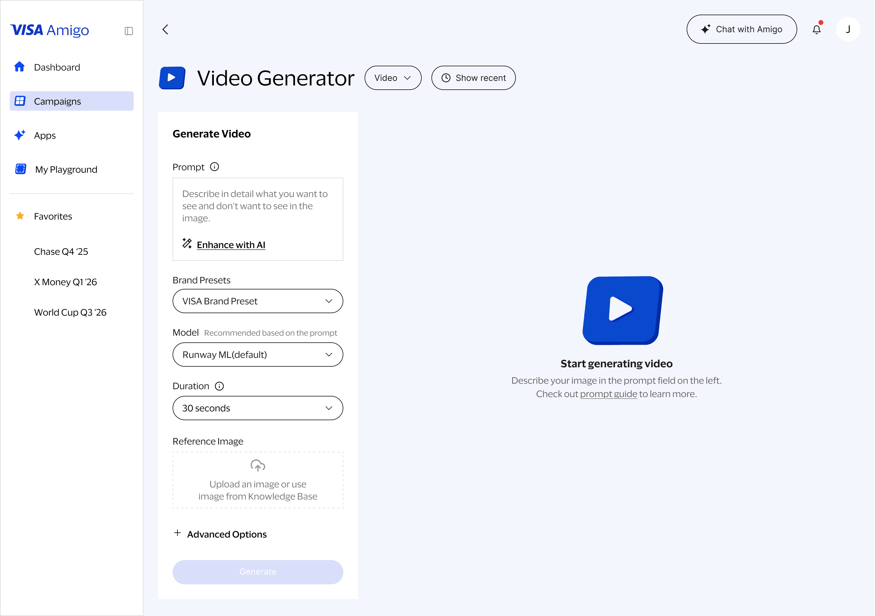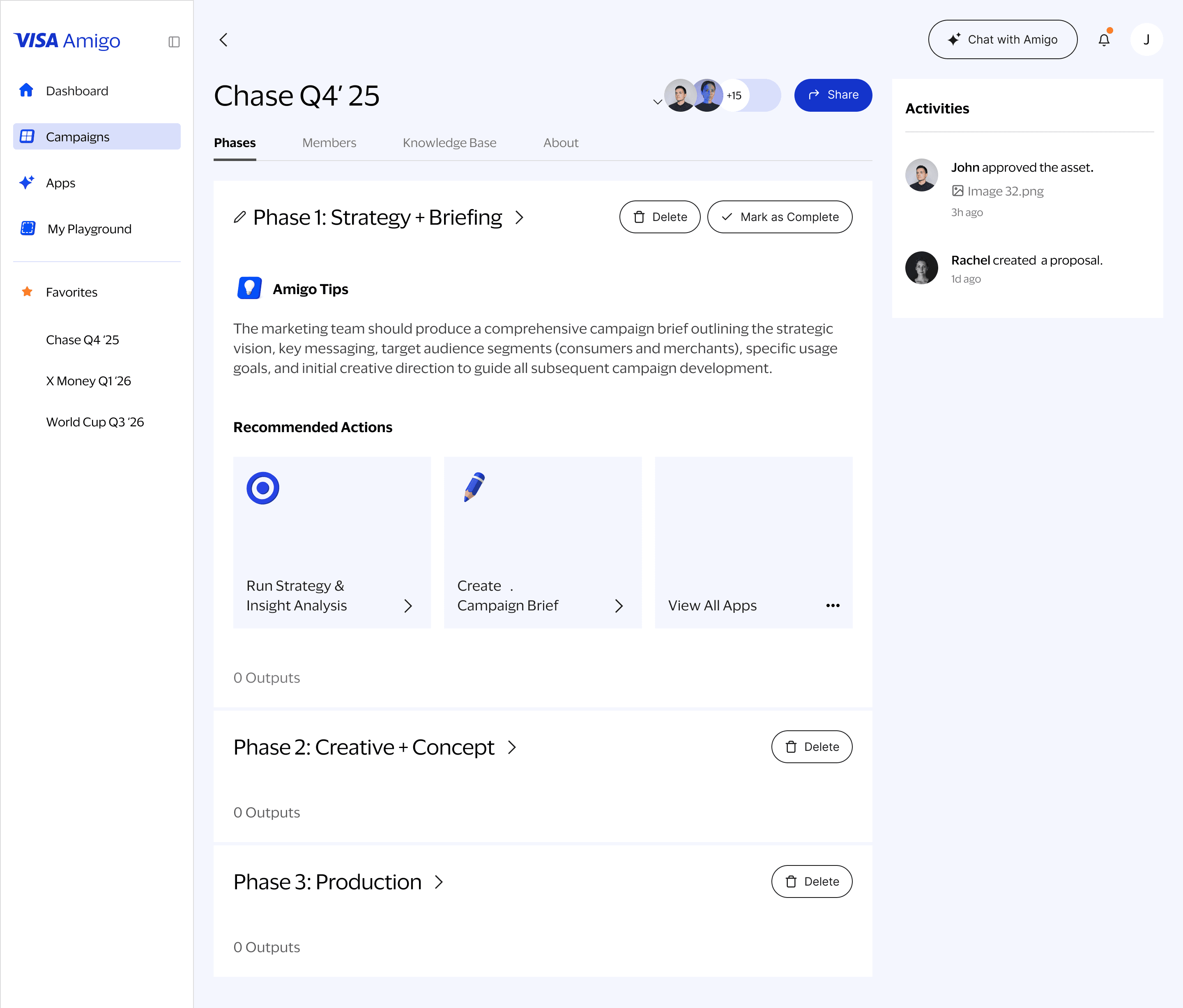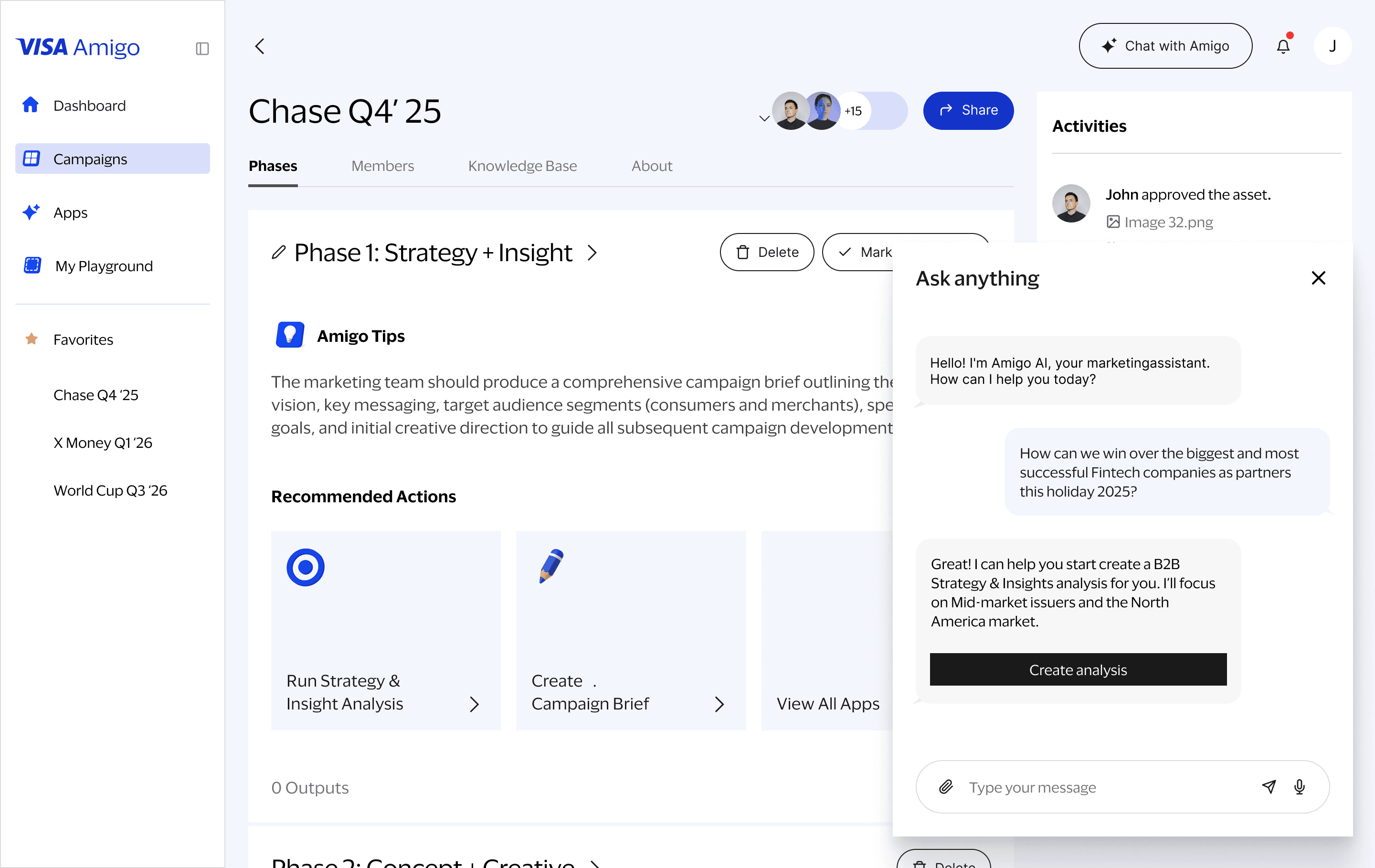 The Visa Amigo dashboard acts as the central starting point for marketers, bringing campaigns, tools, and AI assistance together in one place. It highlights active work, recent updates, and quick-access actions, allowing users to jump seamlessly into content creation, strategy analysis, or asset management. With a clean layout and an always-available AI chat entry point, the dashboard simplifies complex workflows and helps teams stay organized, aligned, and productive.