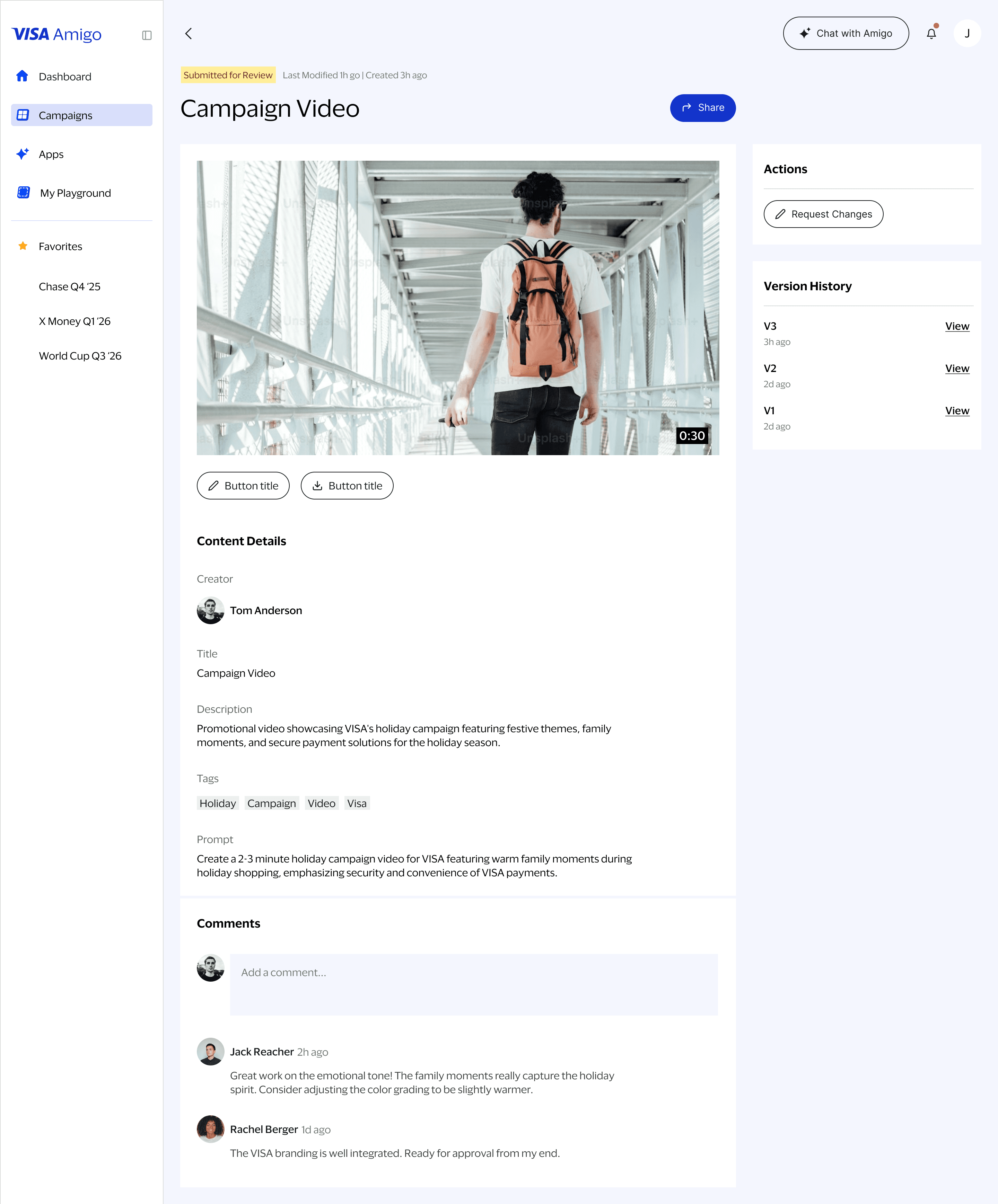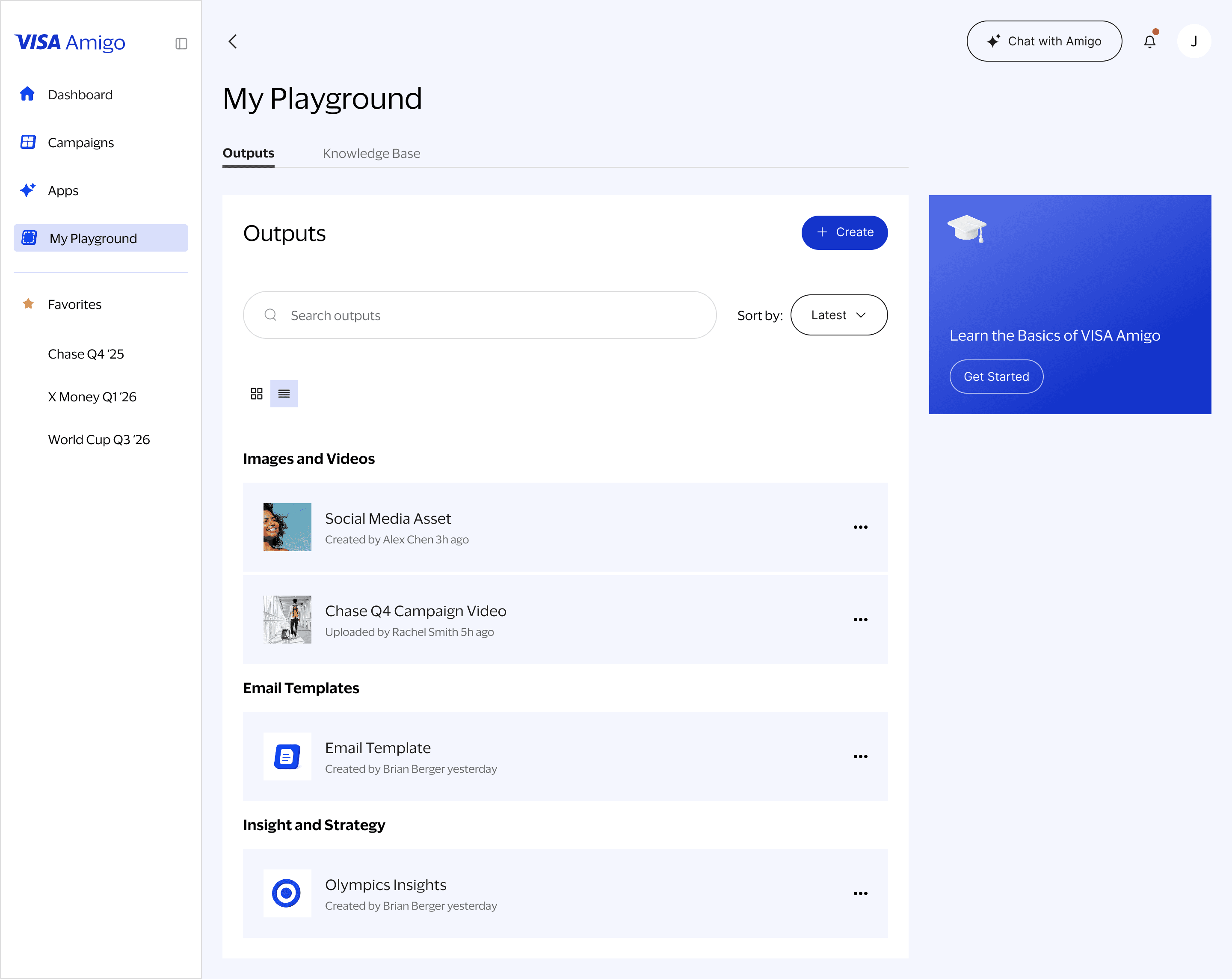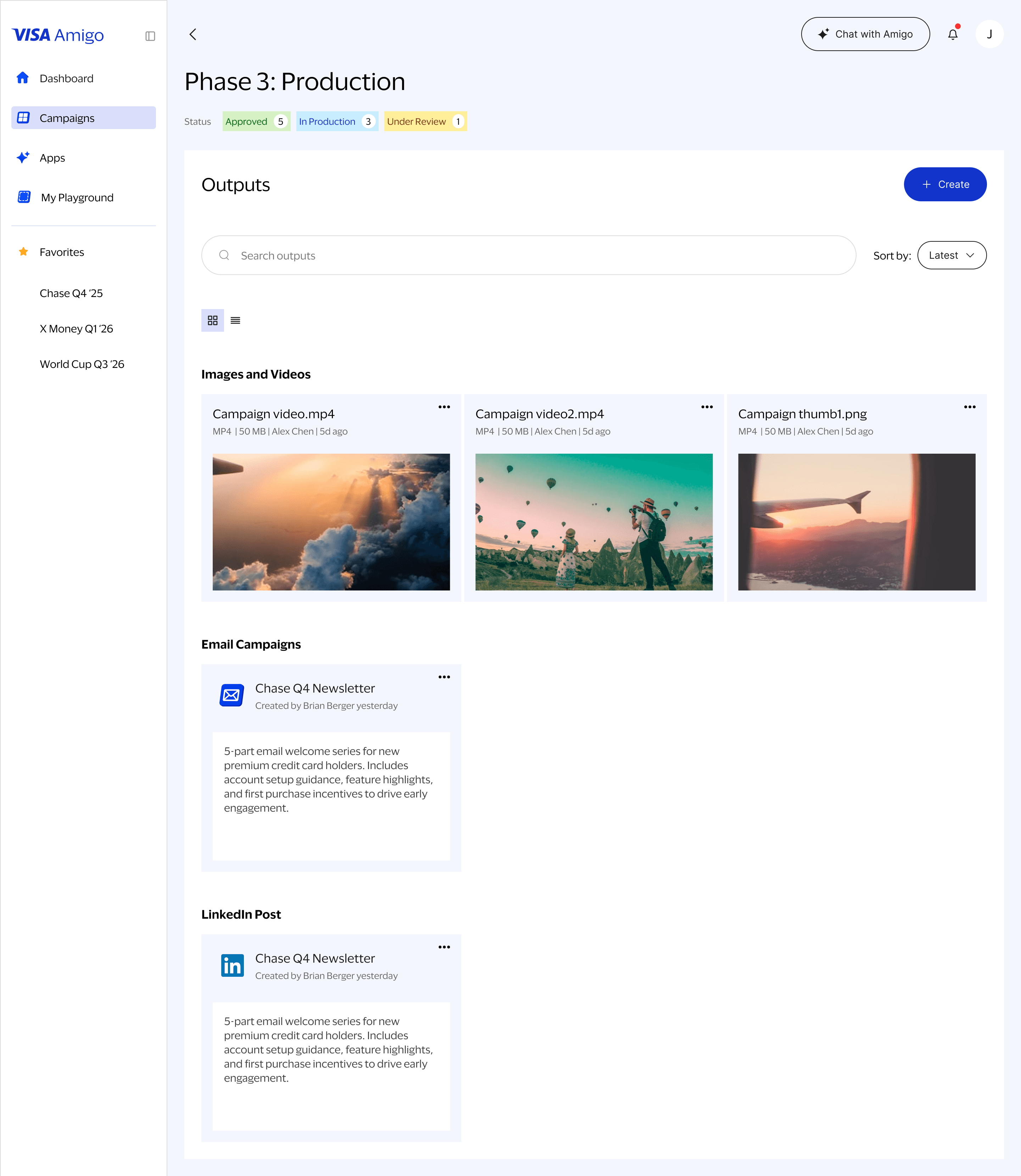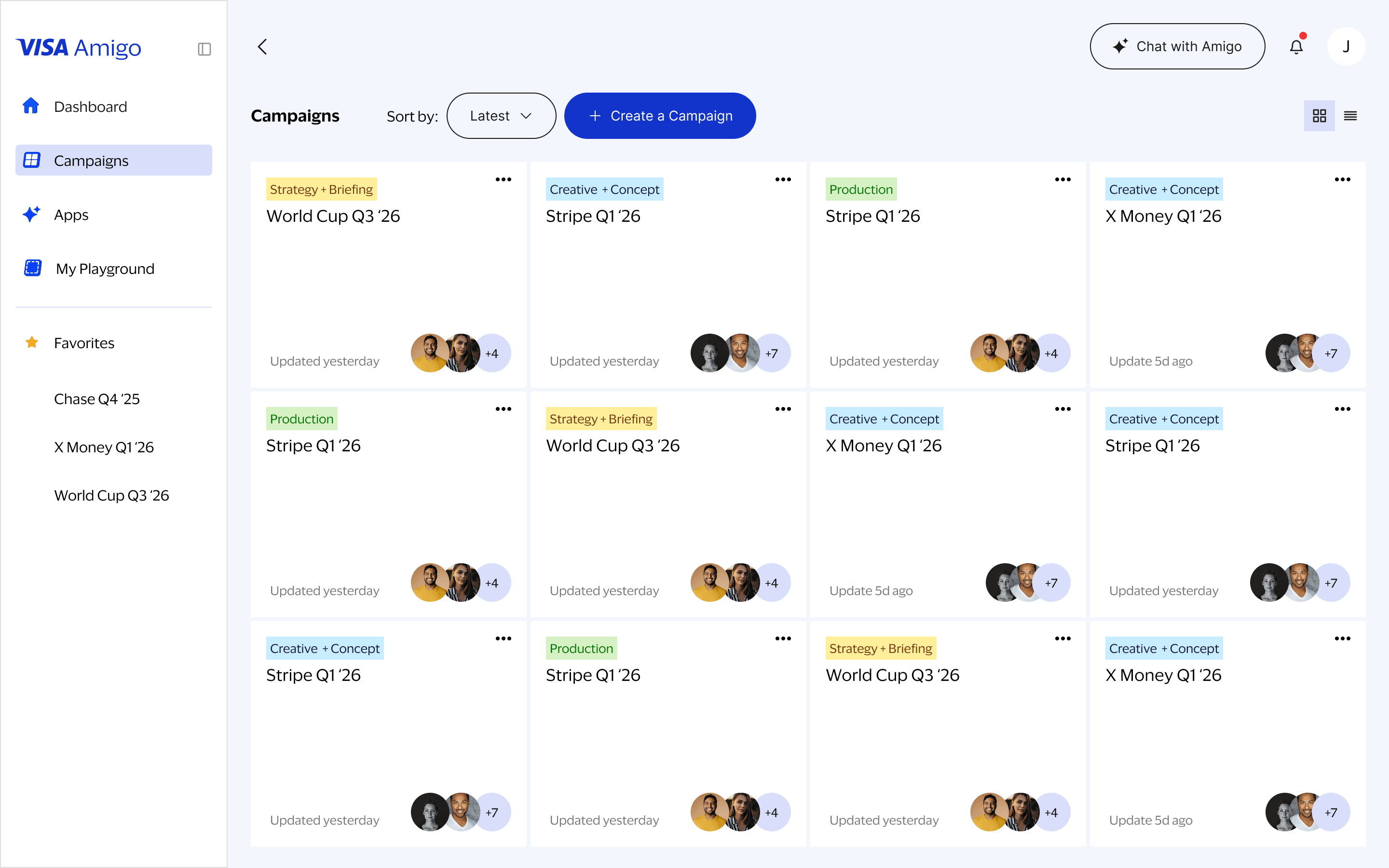 By integrating these capabilities into one cohesive system, Visa Amigo reduces repetitive tasks, improves cross-team alignment, and enables marketers to work faster and more confidently. This project reflects AKQA’s vision of building intelligent, scalable enterprise solutions that elevate productivity through thoughtful design.
