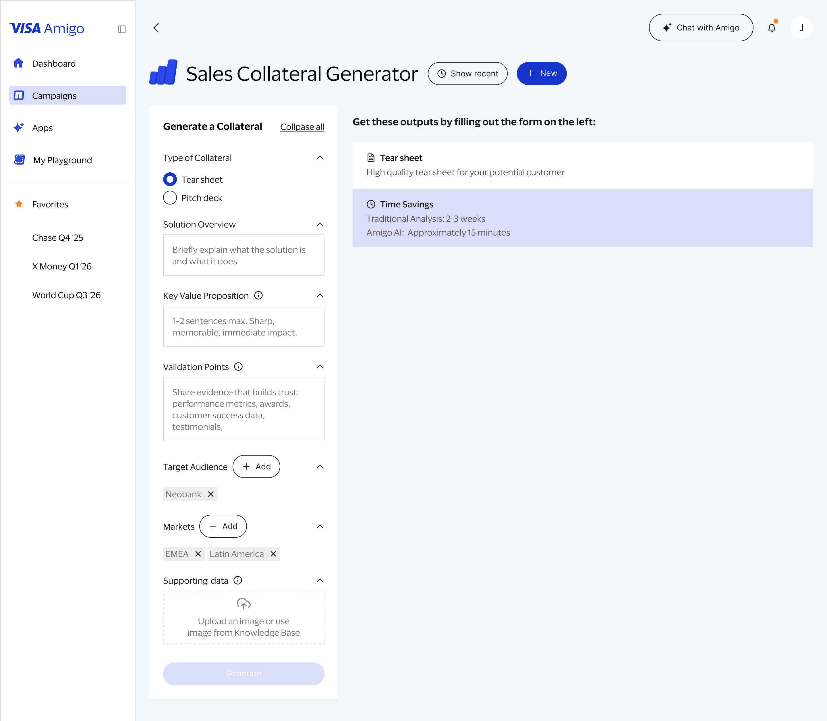 Visa Amigo is a B2B SaaS platform designed by AKQA to help the Visa Marketing team streamline and enhance their day-to-day work through AI. The platform brings together a centralized dashboard and five specialized tools—Image and Video Generator Tool, Brief Creator Tool, Strategy & Insights Tool, RFP Intelligence Tool, and Sales Collateral Tool—providing a unified workflow for content creation, strategic planning, and internal operations.