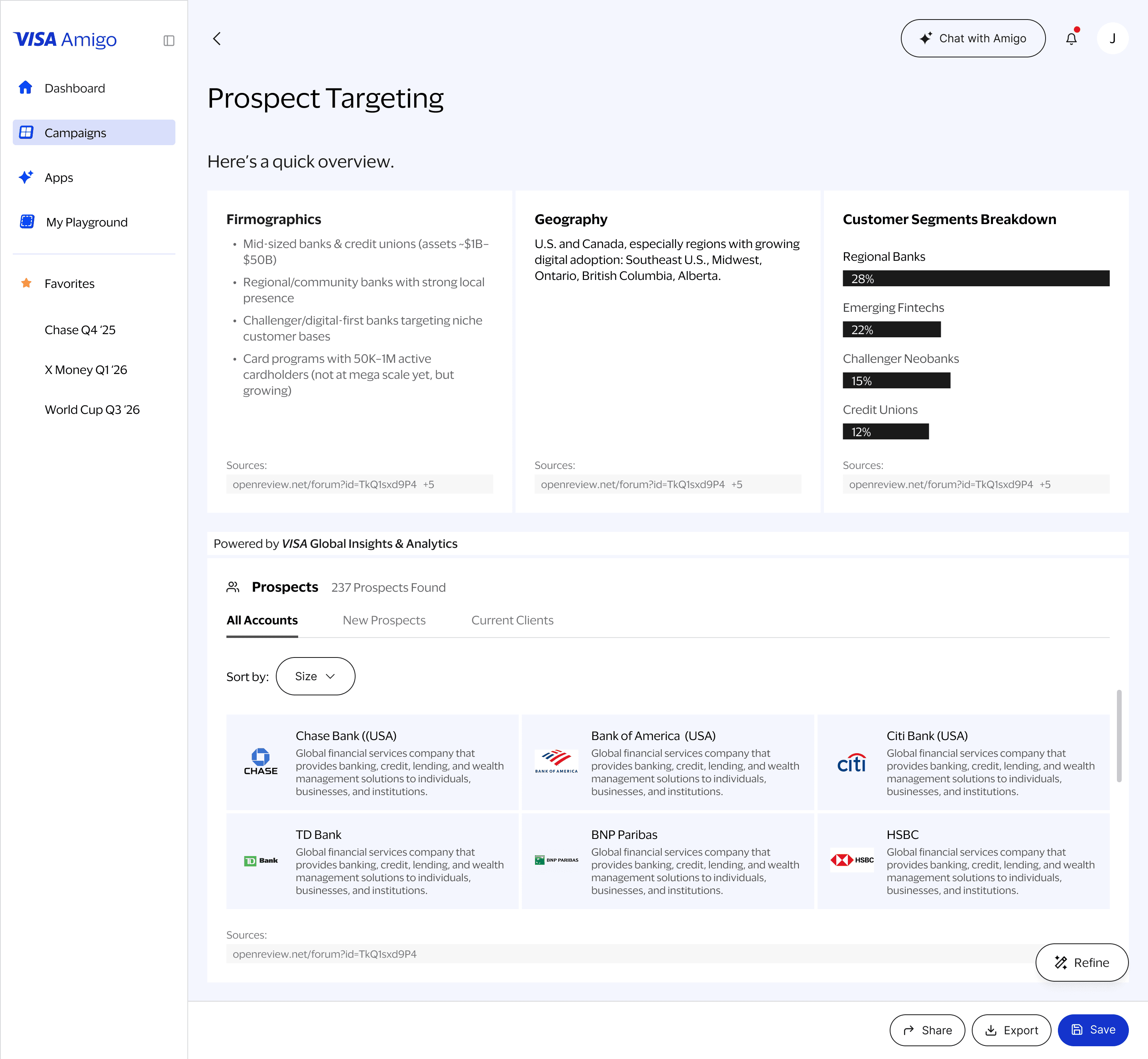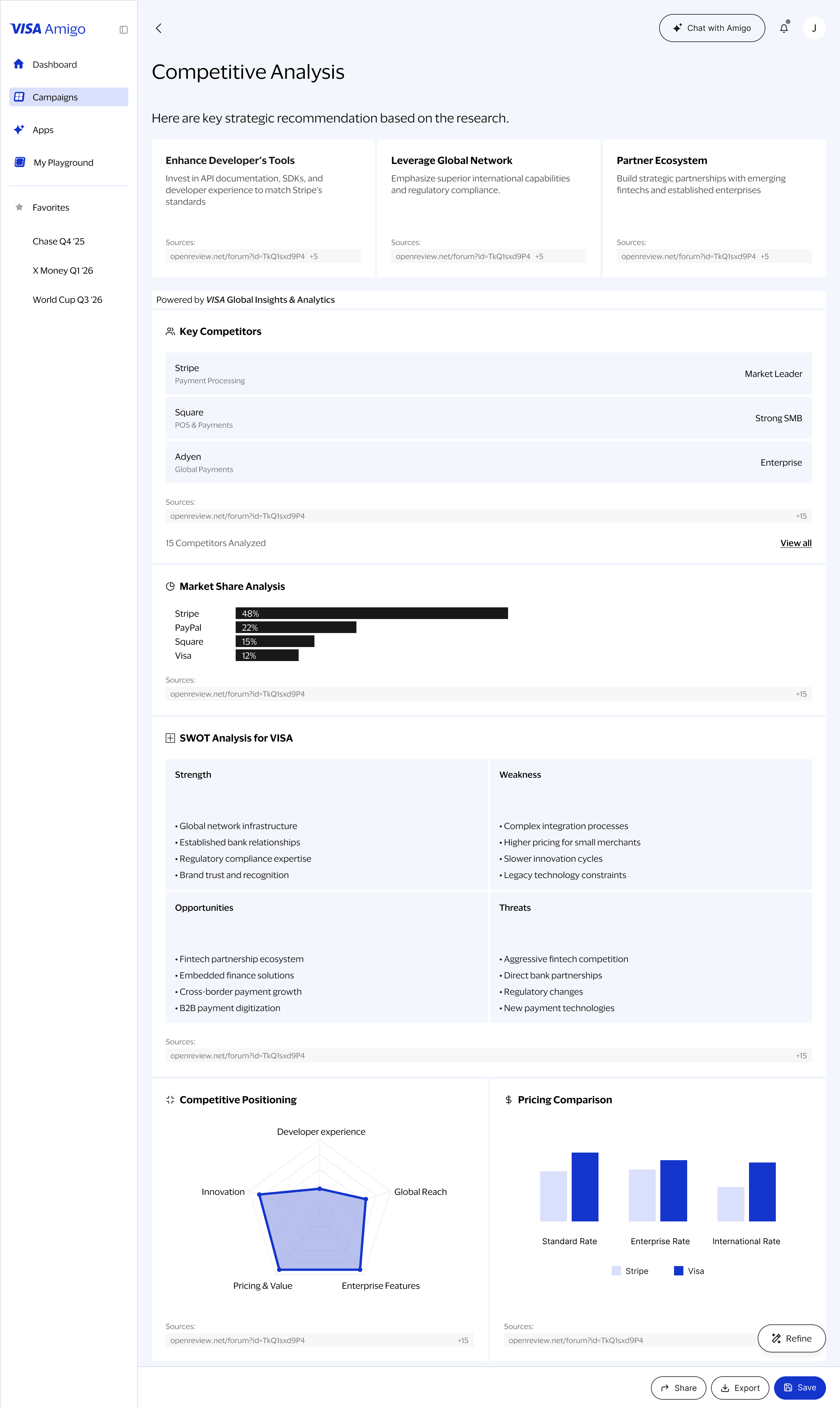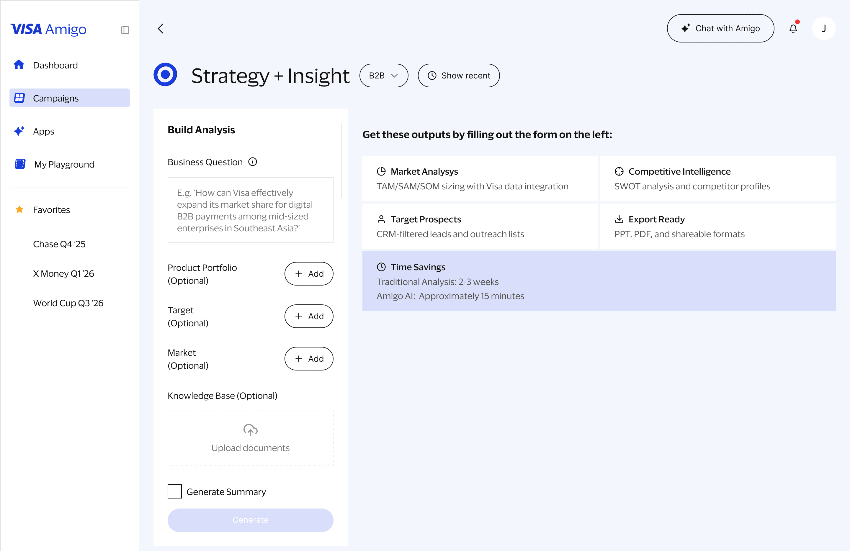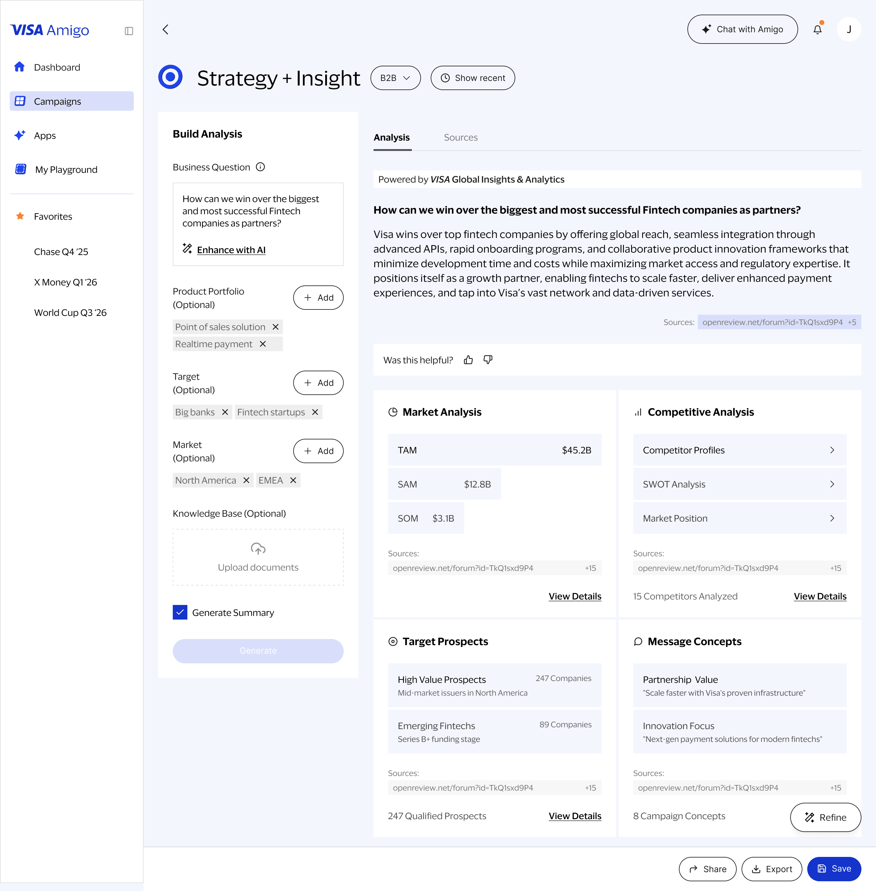 The Strategy & Insights Tool gives Visa marketers an instant way to understand their market, competitors, and target prospects without running a long research cycle. By entering a business question and a bit of optional context, the tool automatically pulls data from Visa’s intelligence ecosystem and generates a full strategic view—market sizing, competitive landscape, SWOT, pricing comparisons, and qualified prospect lists.