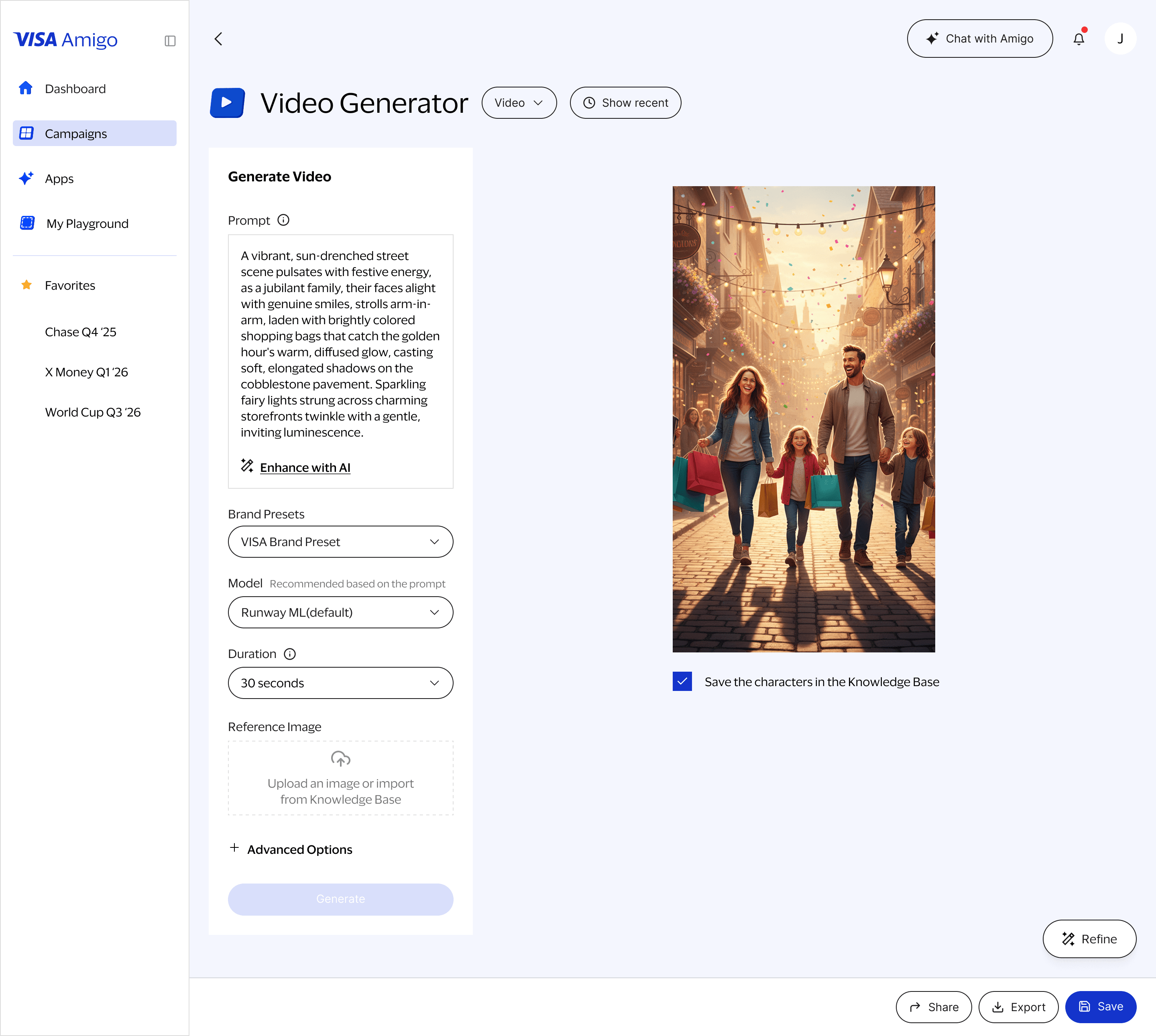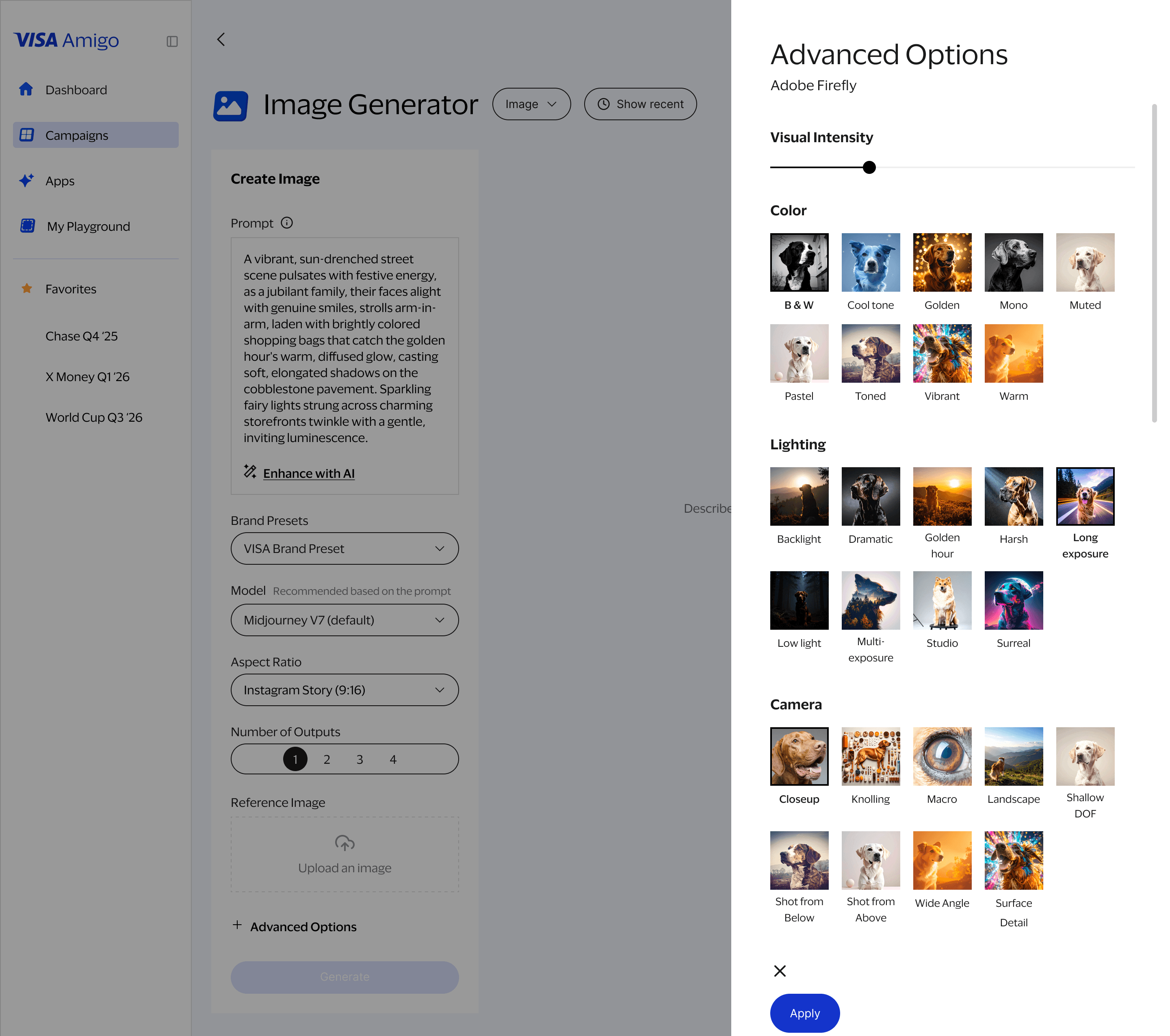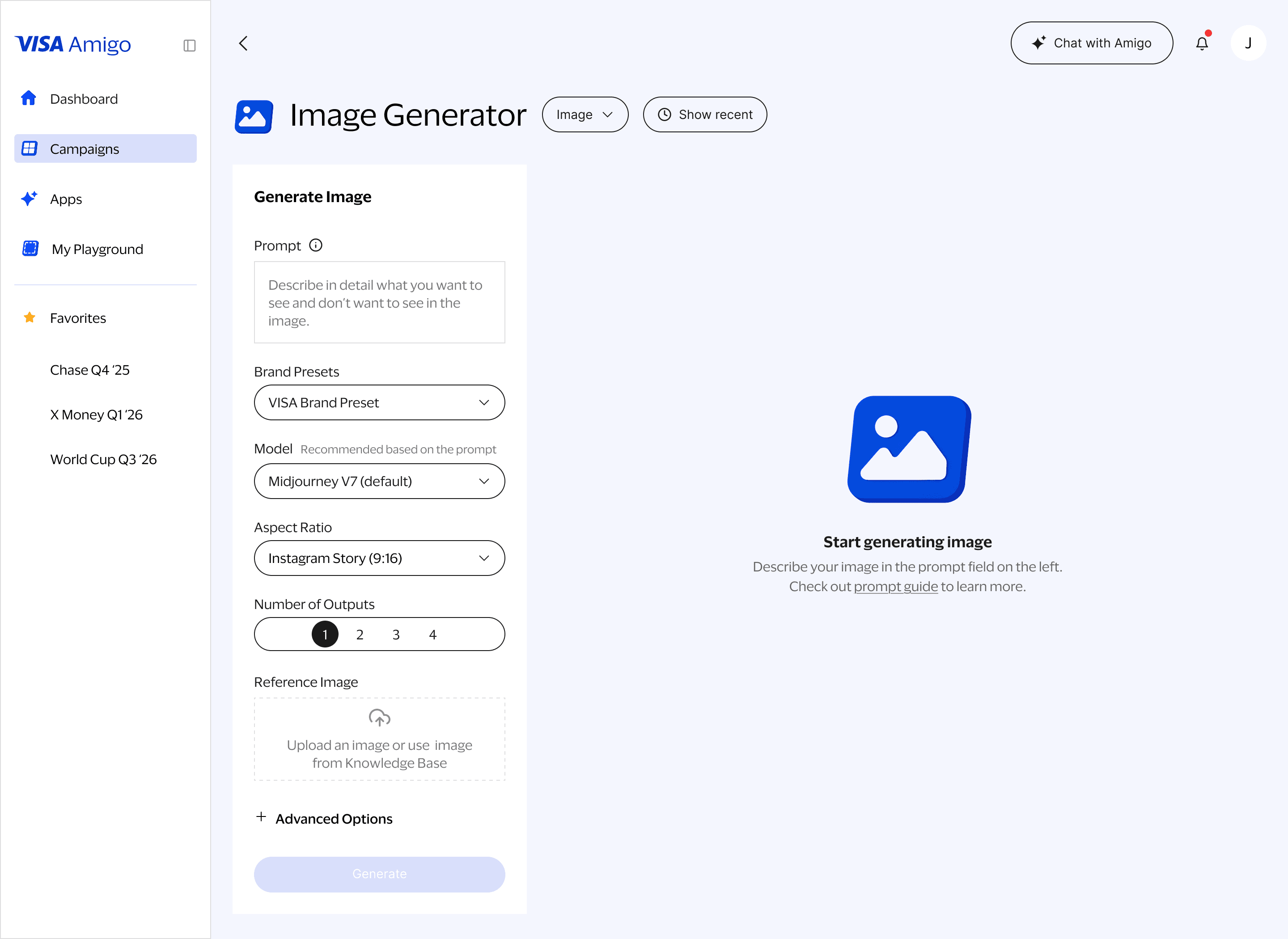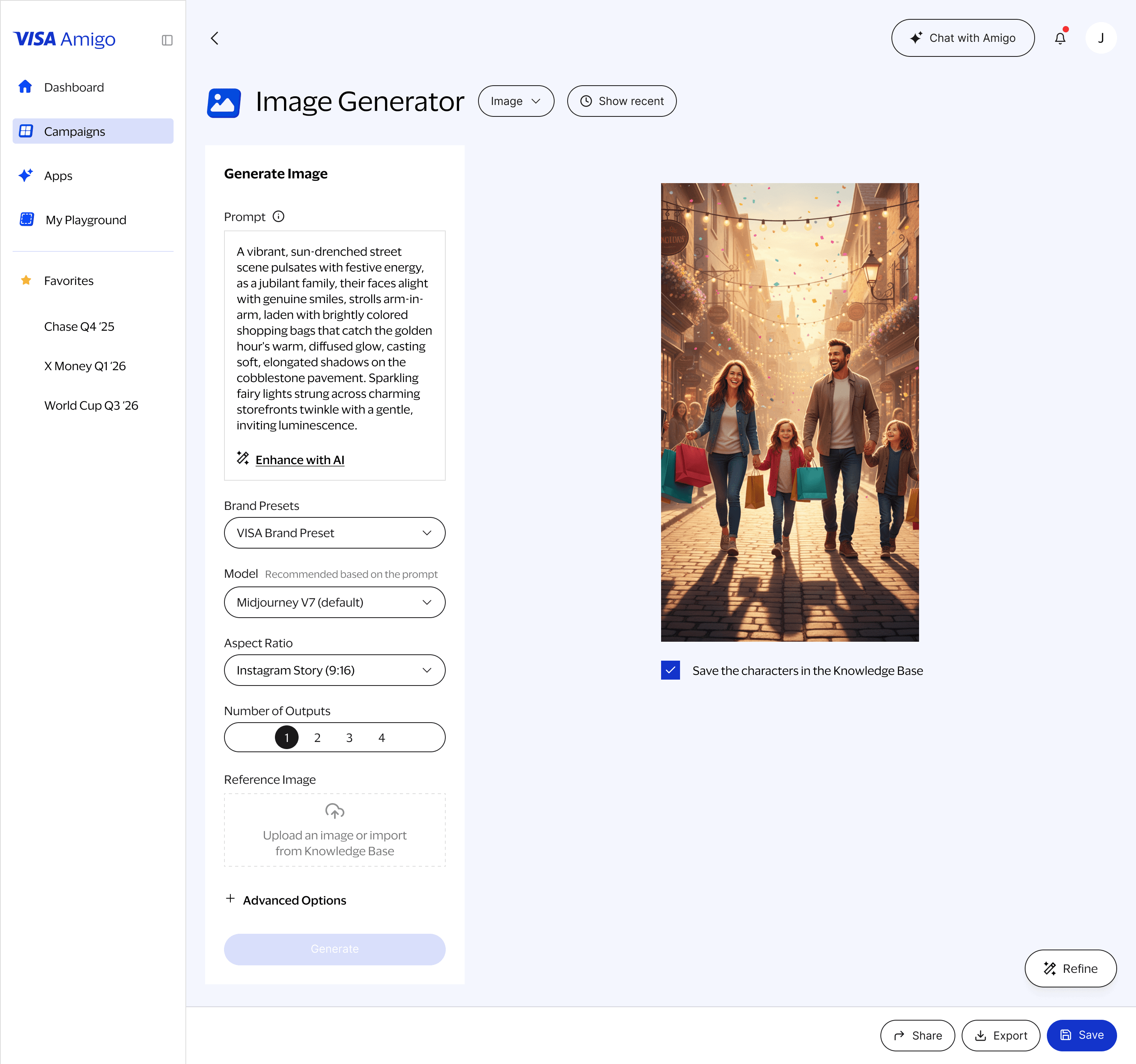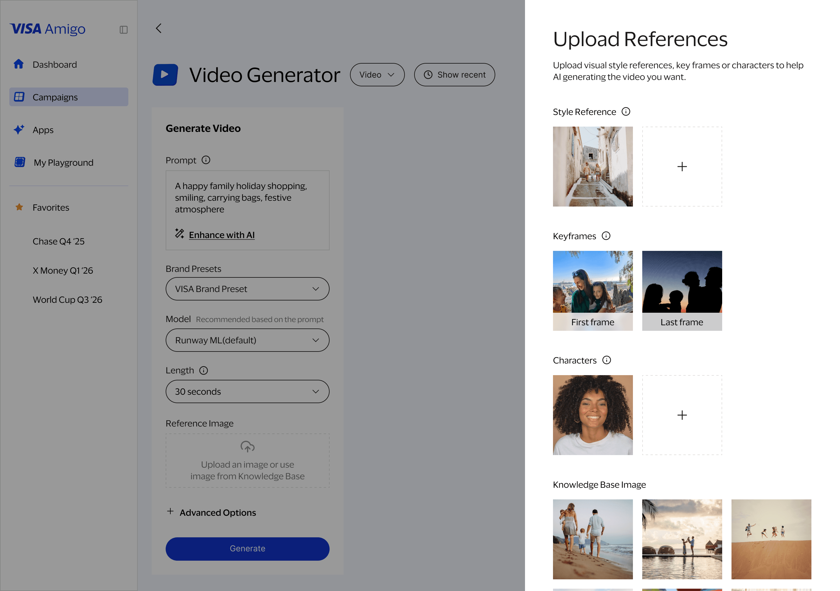 The Image & Video Generator Tool enables Visa marketers to create on-brand visual content in seconds using AI. Designed for both simplicity and creative control, the tool allows users to generate high-quality images or short videos directly from a text prompt, with support for brand presets, model selection, aspect ratios, keyframes, characters, and reference images.