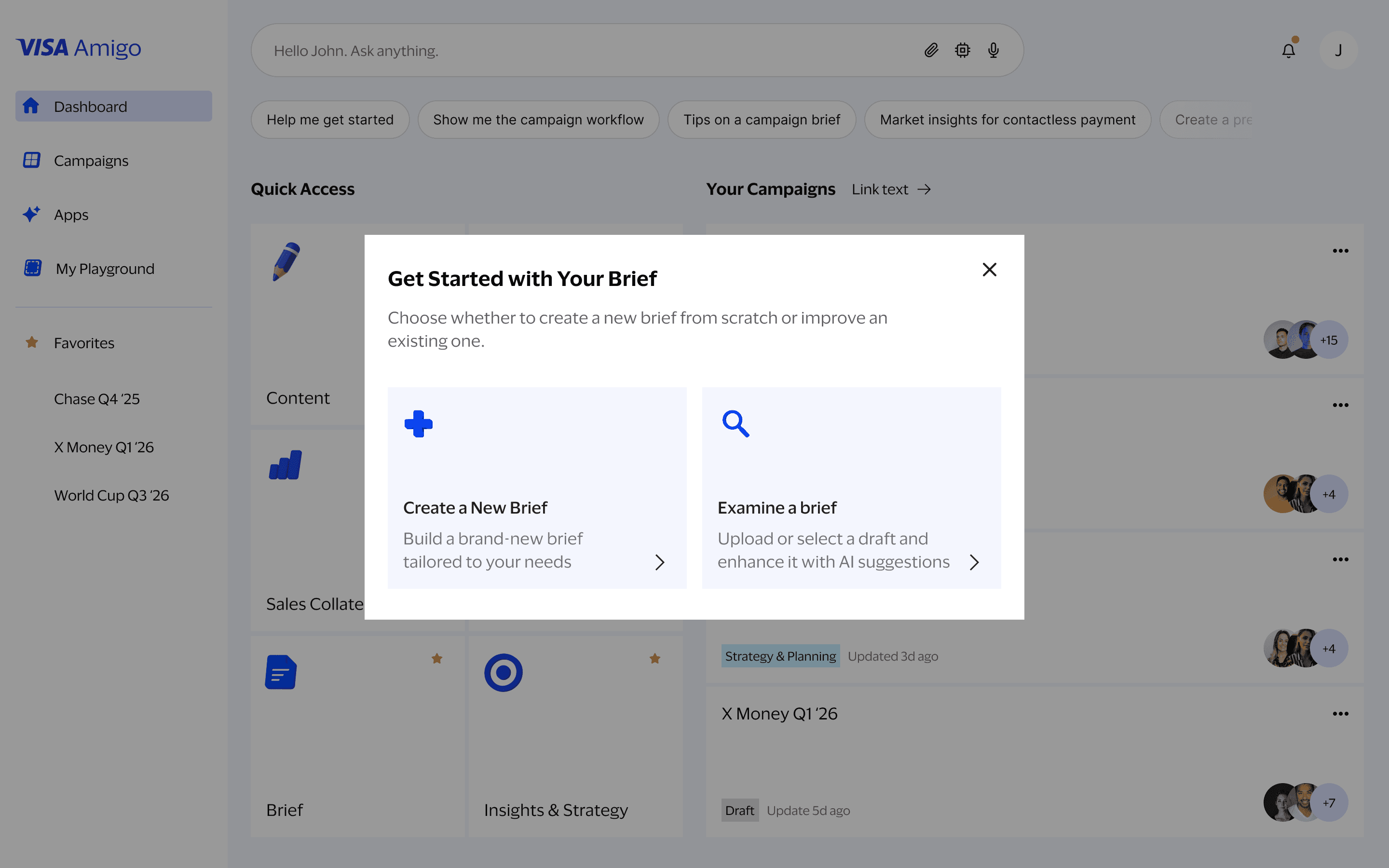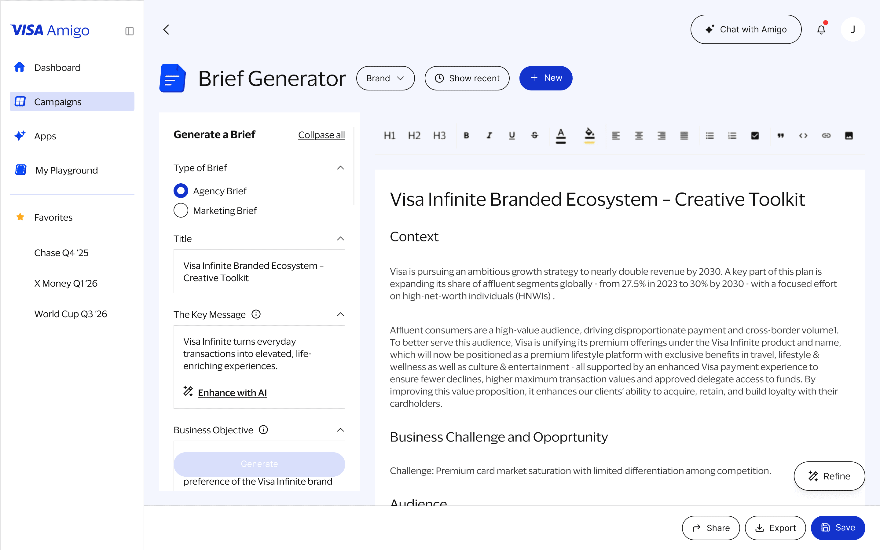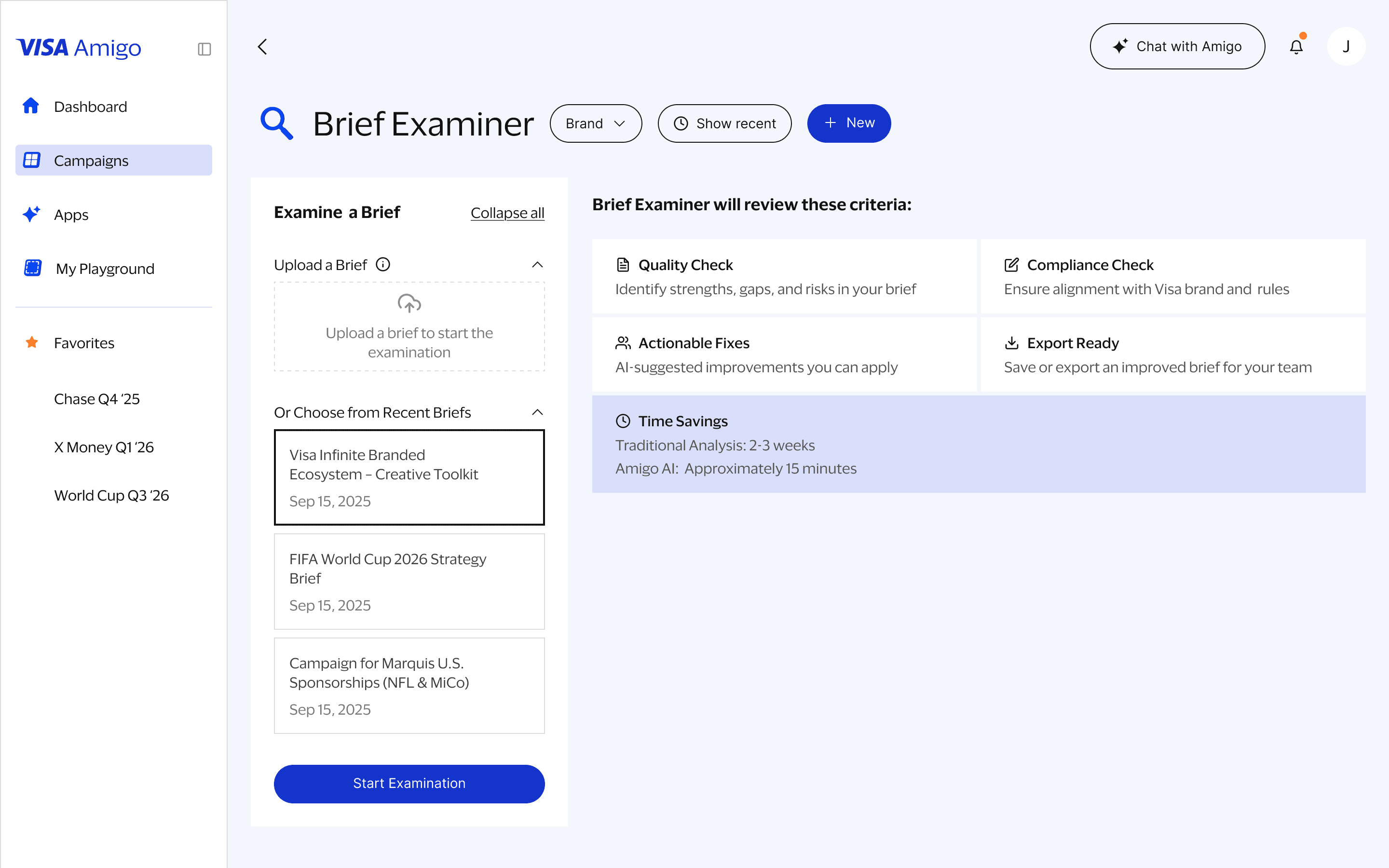 The Brief Creator & Examiner Tool helps Visa marketers build stronger, clearer, and brand-aligned campaign briefs with the support of AI. Users can either generate a new brief from scratch or upload an existing draft for AI-powered evaluation.