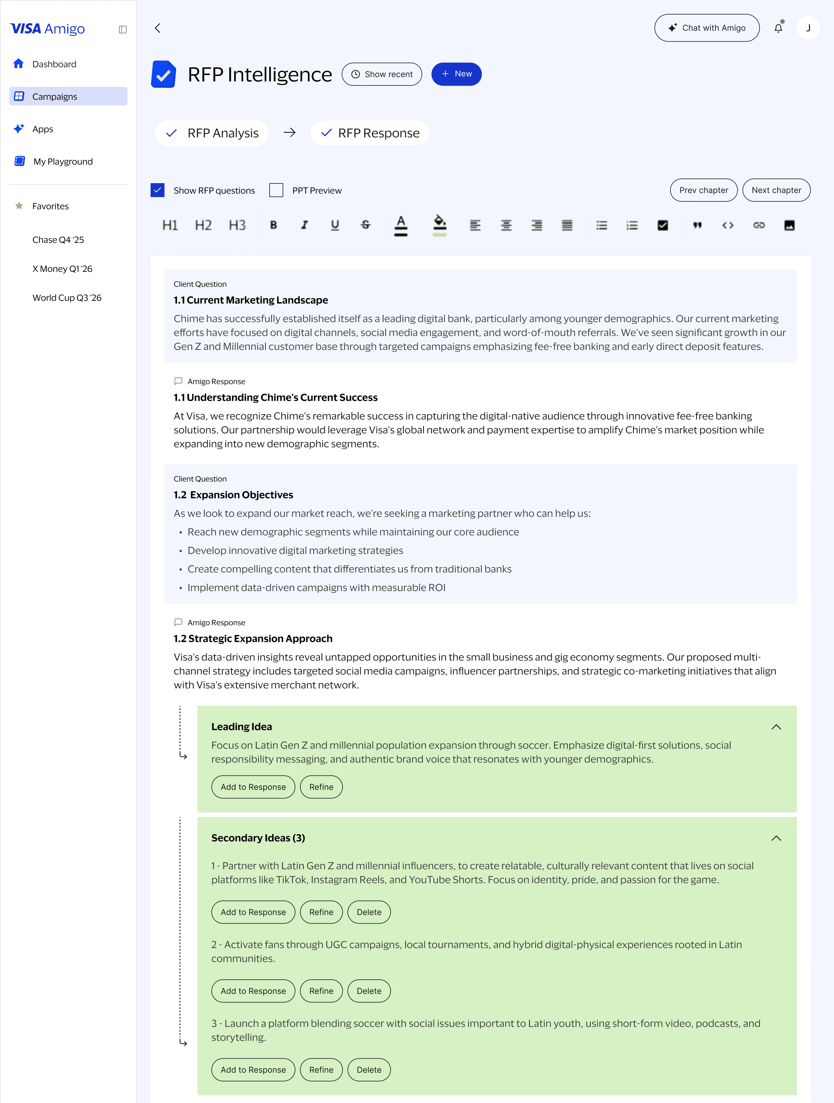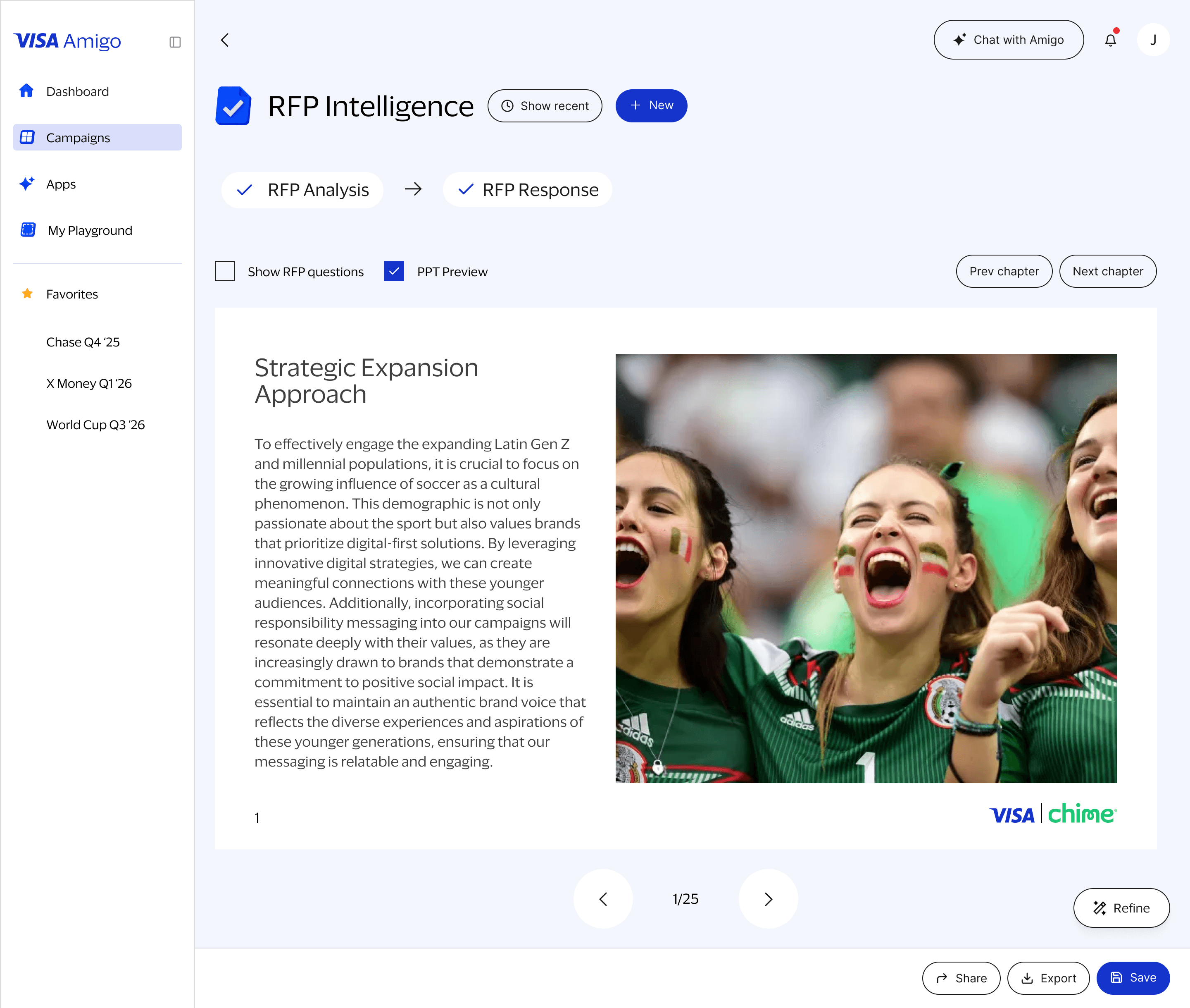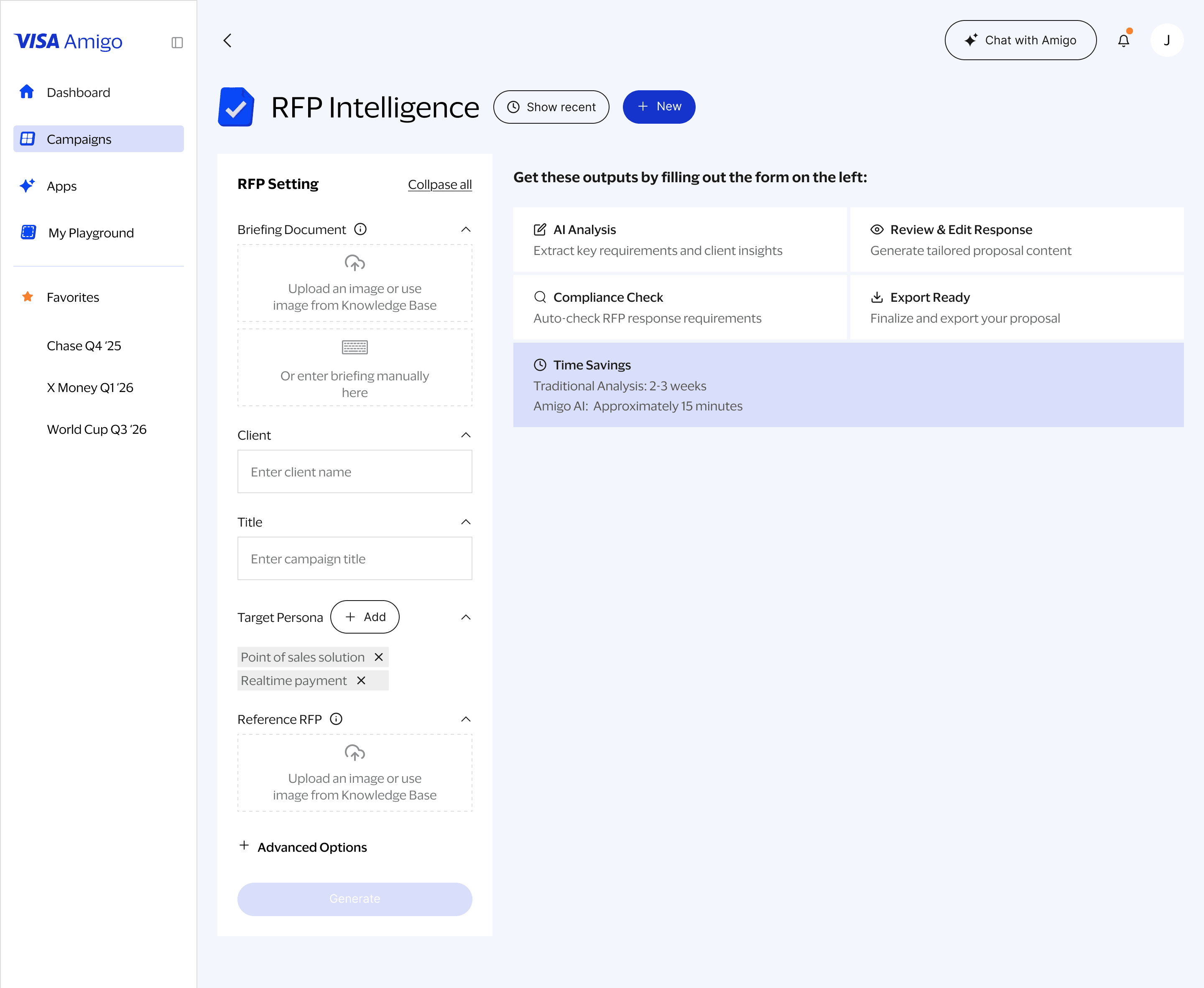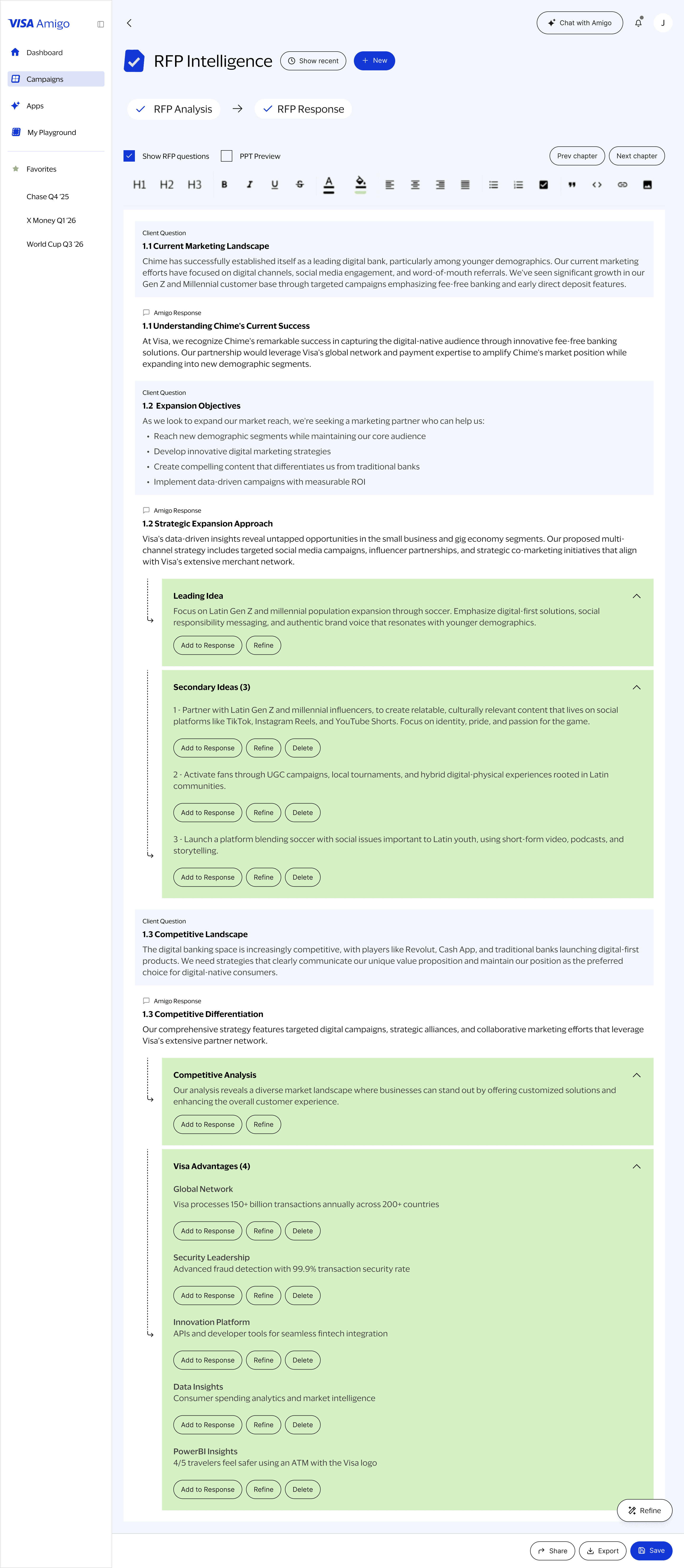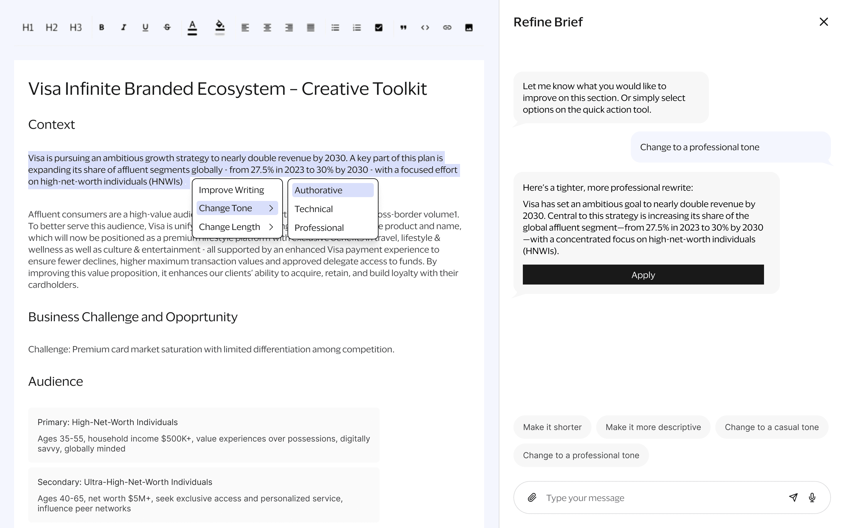 By turning a traditionally 2–3-week review process into a streamlined 15-minute workflow, this tool accelerates strategic planning while ensuring every brief meets Visa’s standards and drives alignment across teams.
